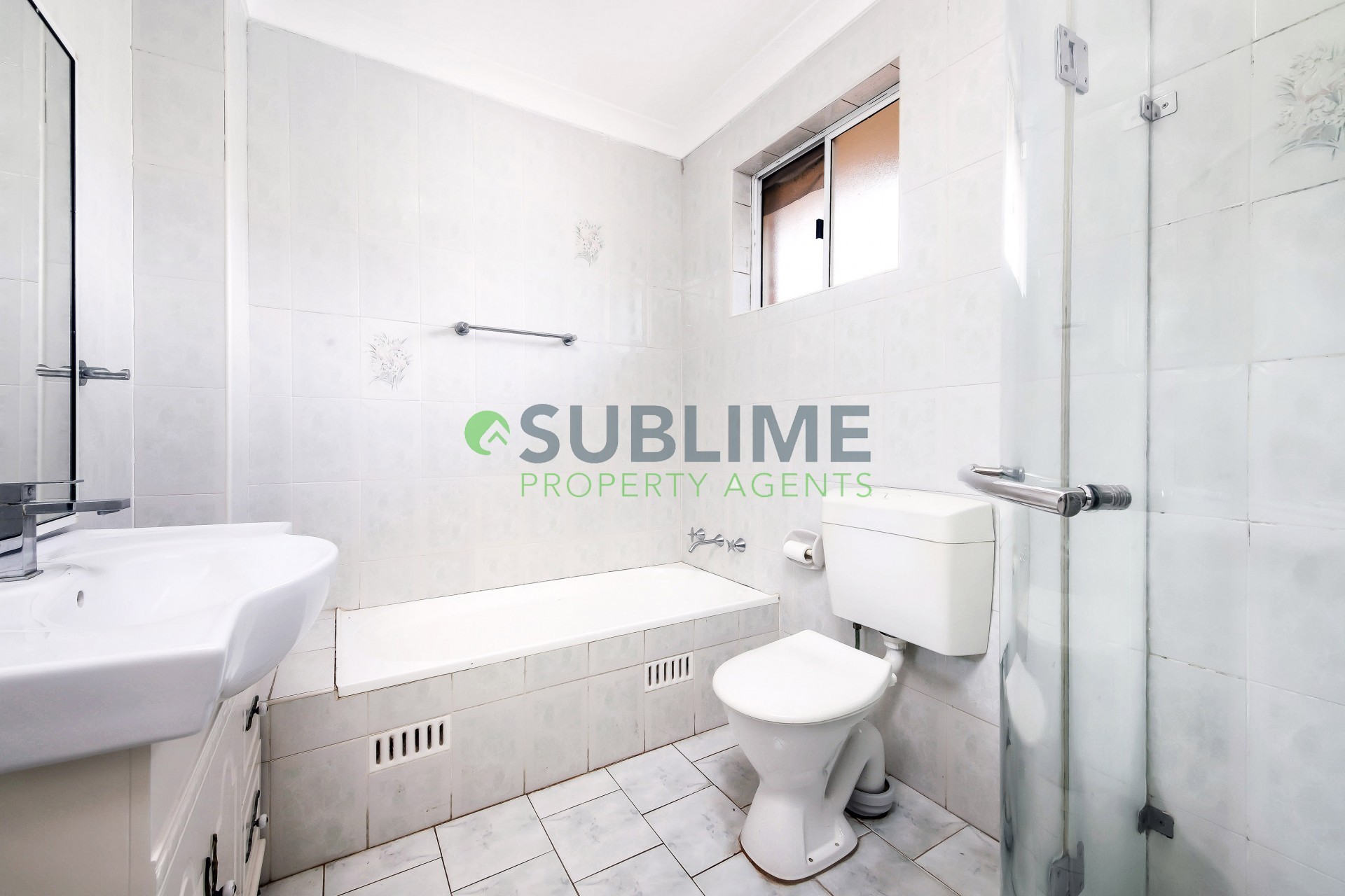 - Modern, tiled bathroom includes bath and separate shower