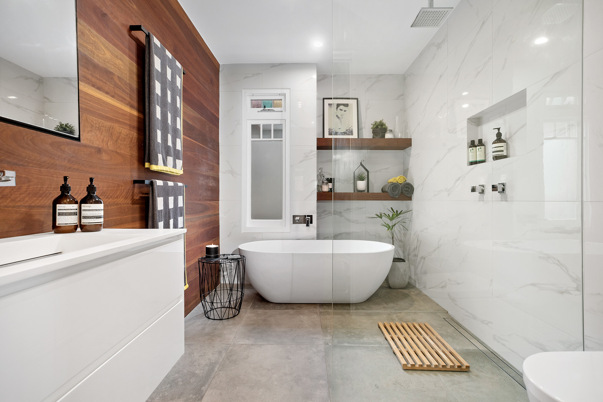 • Exquisite main bathroom with freestanding stone bath and spotted gum timber feature wall