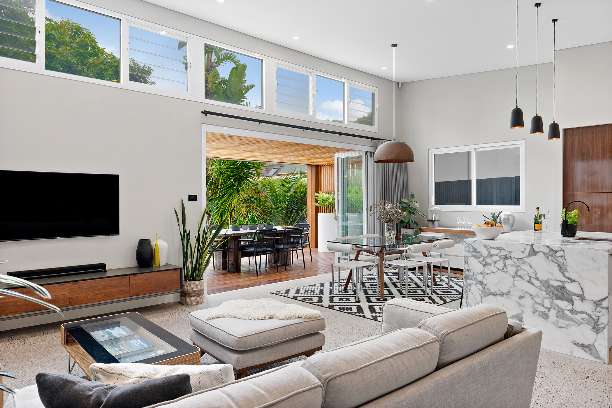 The architecturally designed, spacious open plan living, inspired design and sleek quality finishes combined with landscaped tropical resort style gardens offer effortless indoor/outdoor entertaining.