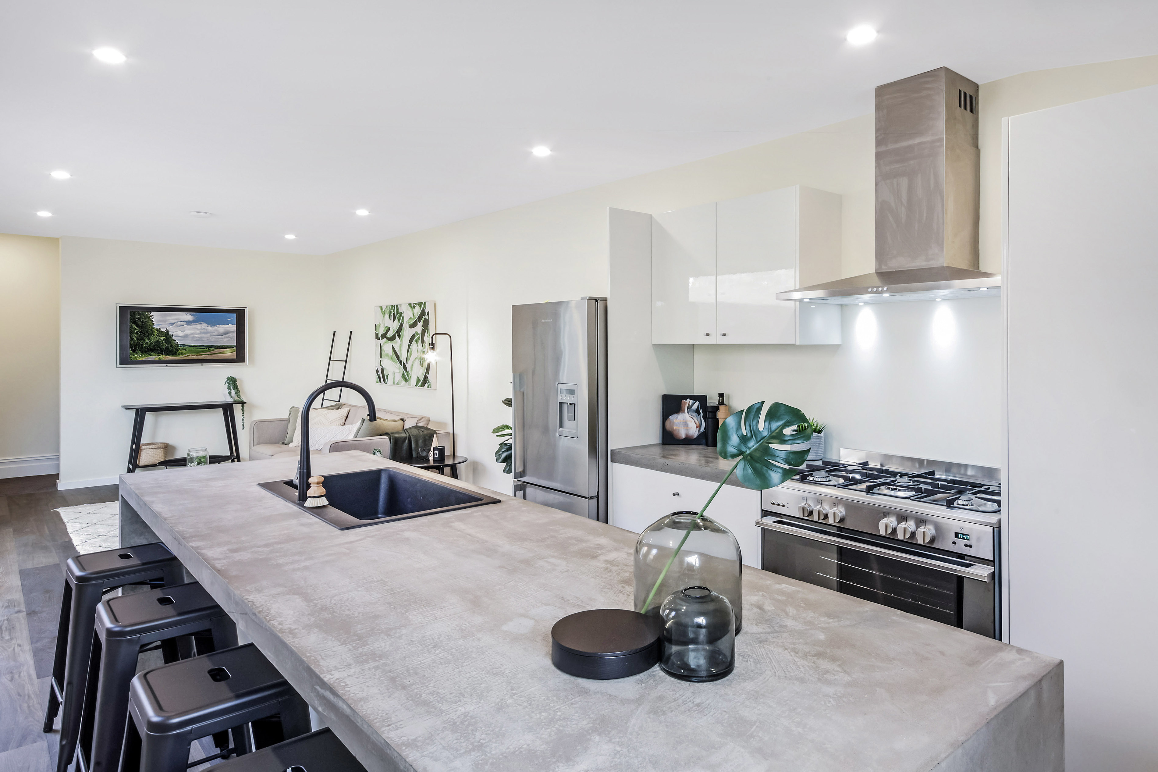- Ultra modern kitchen with gas cooking and large polished concrete bench tops and breakfast bar.