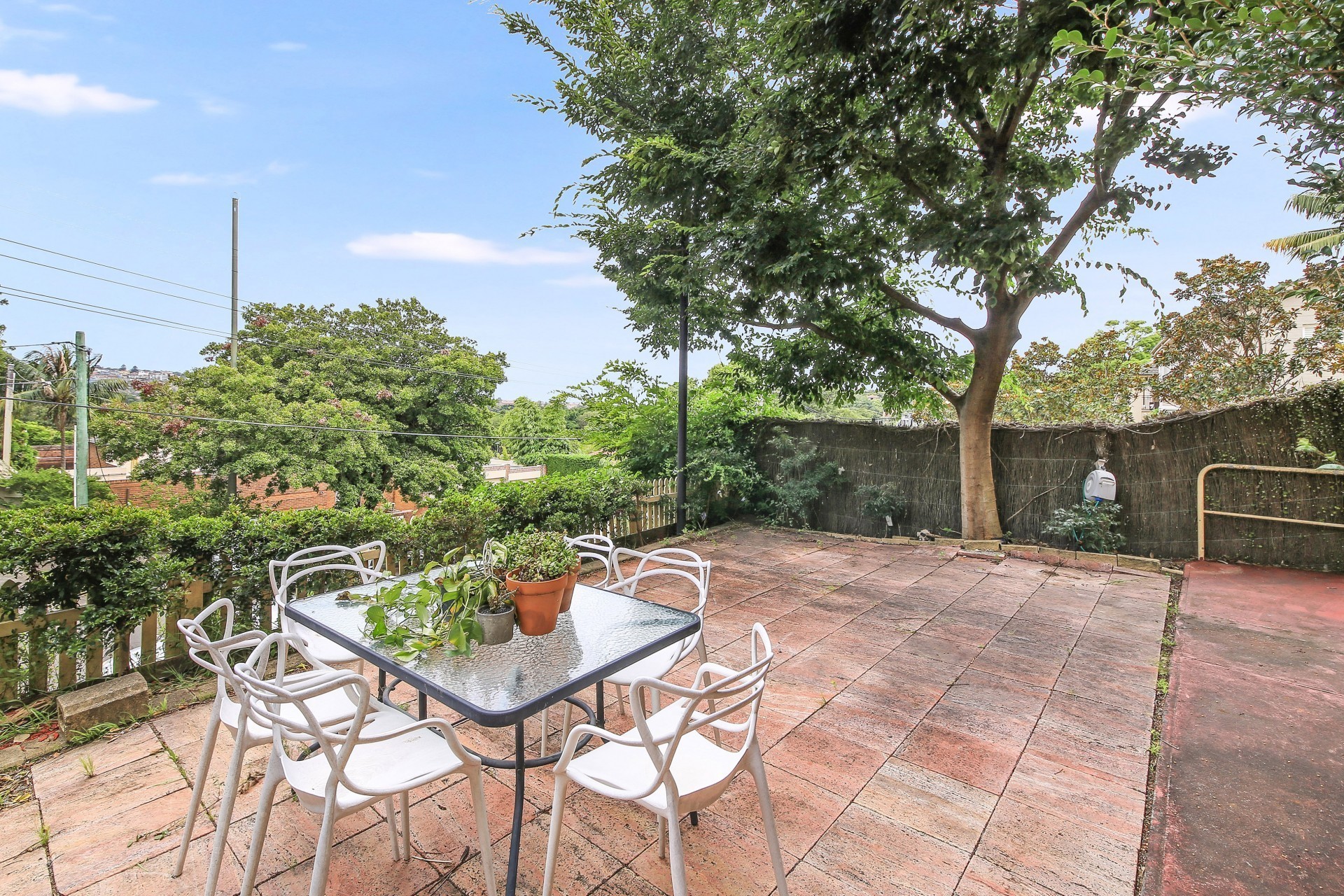 Sunny communal paved patio and garden entertainment area