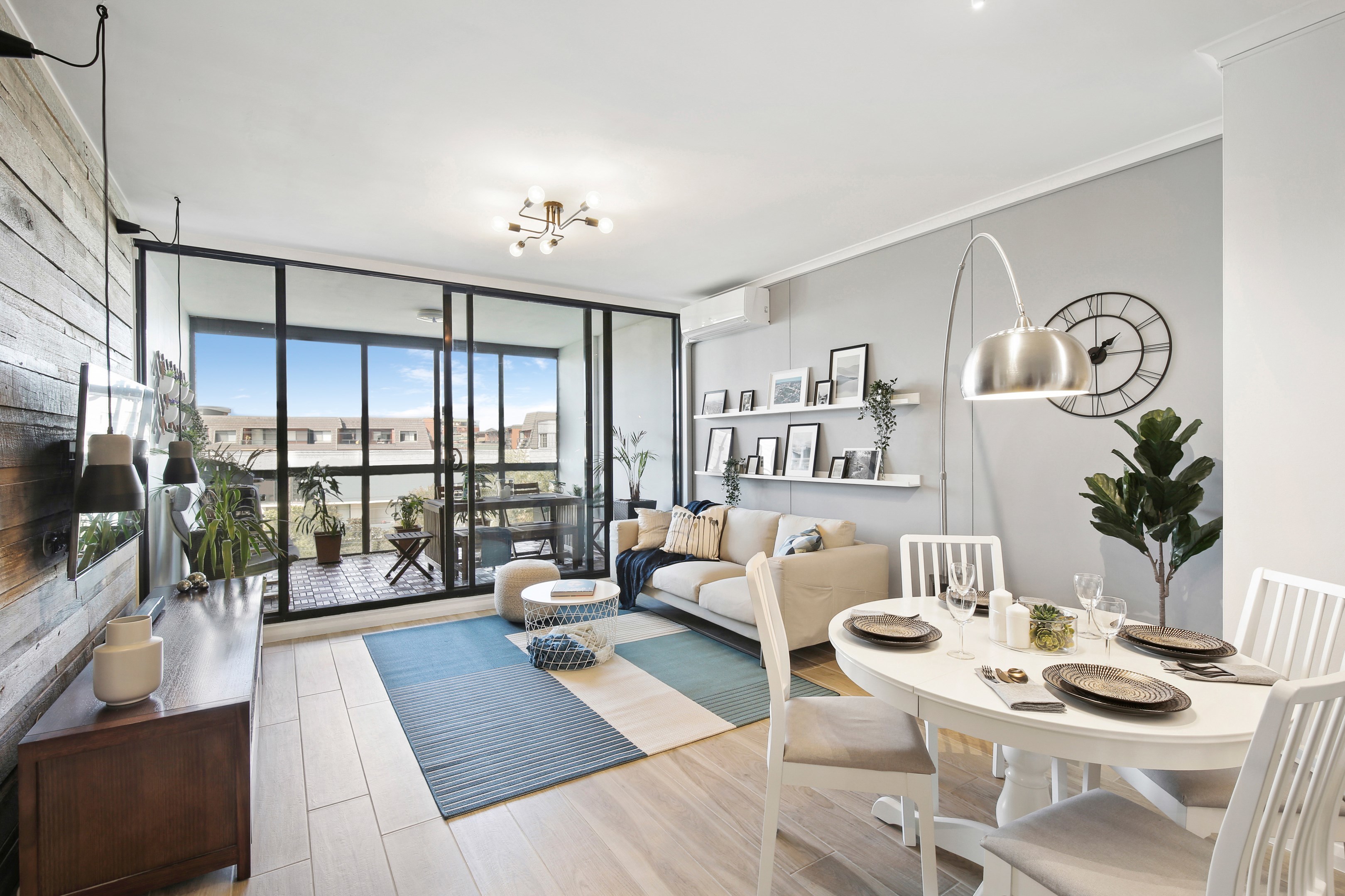 - Bespoke light fittings, natural wood feature wall + mirrored wall in living
