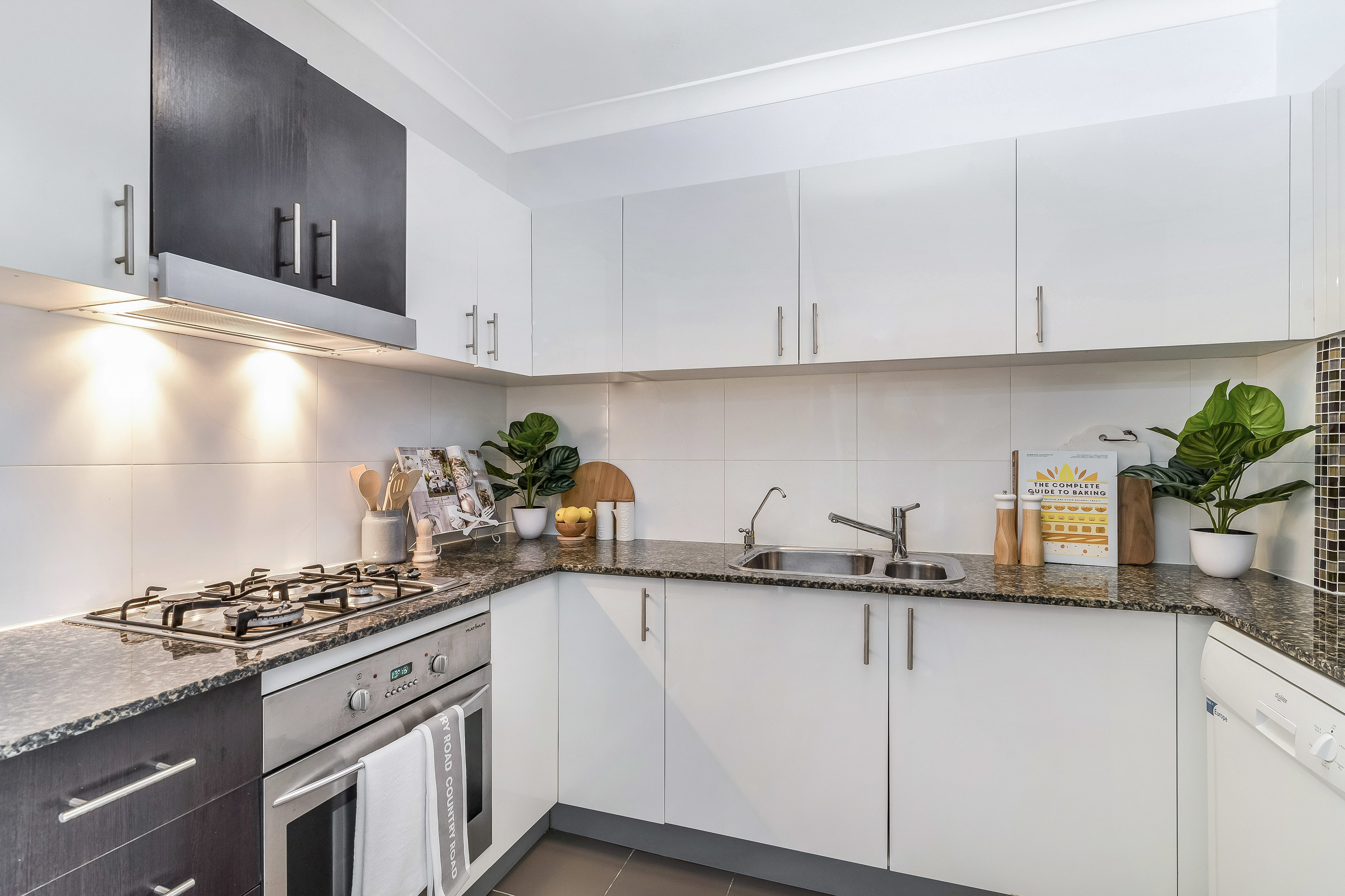 - Sleek modern kitchen with stone bench tops and stainless steel appliances, dishwasher, gas cooktop, electric oven and range-hood.