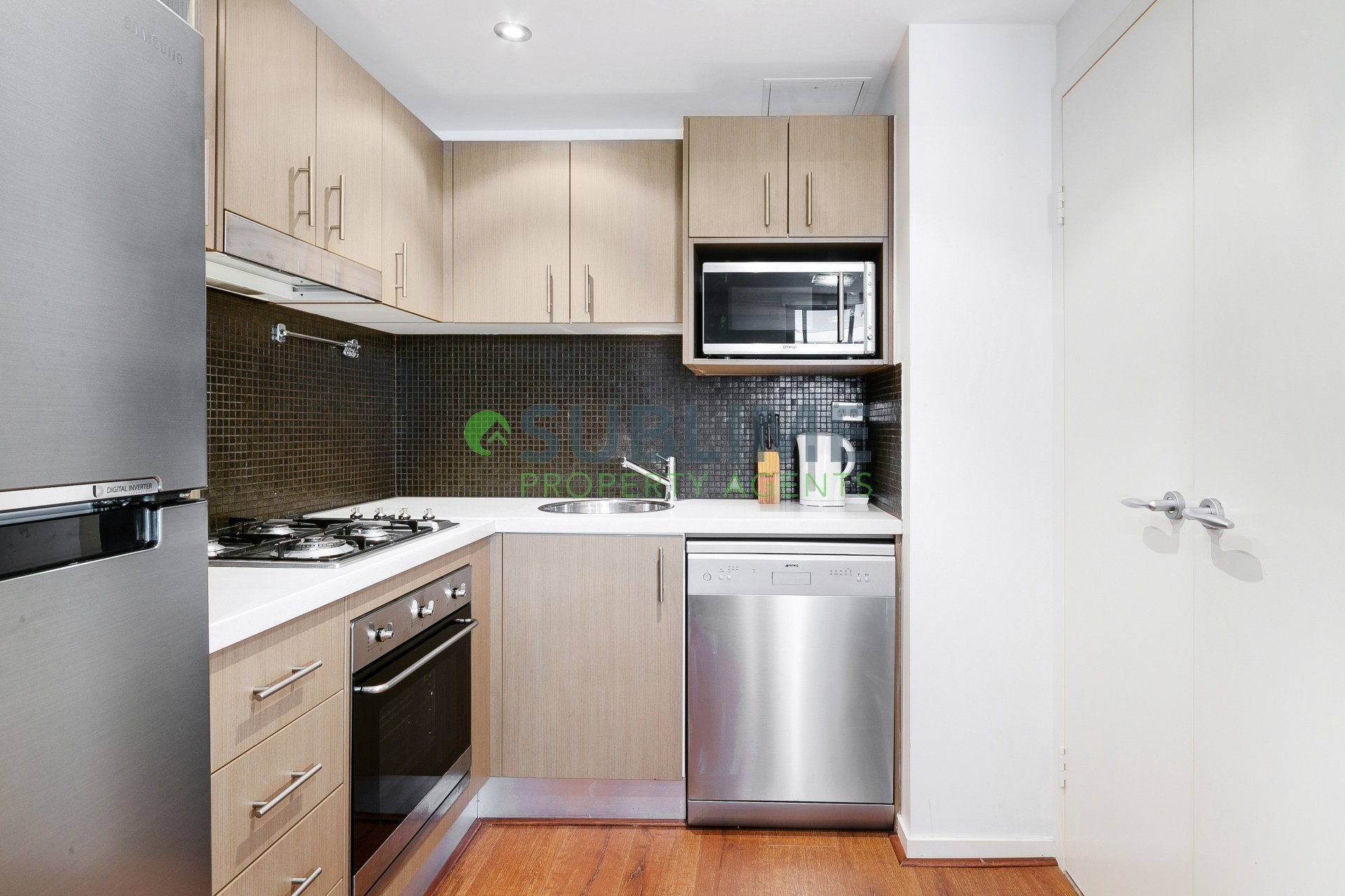 - Galley style kitchen with gas cooking & stainless-steel appliances.