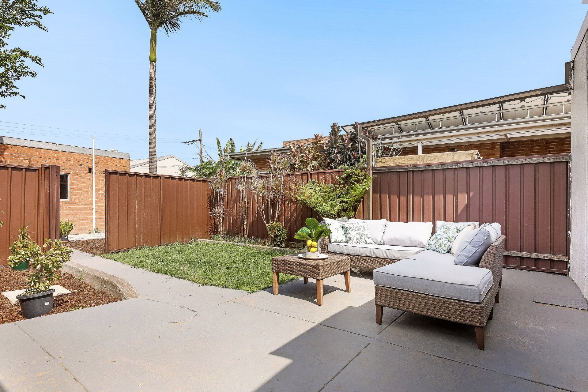 Sunny outdoor entertaining area with a grass patch and a garden bed