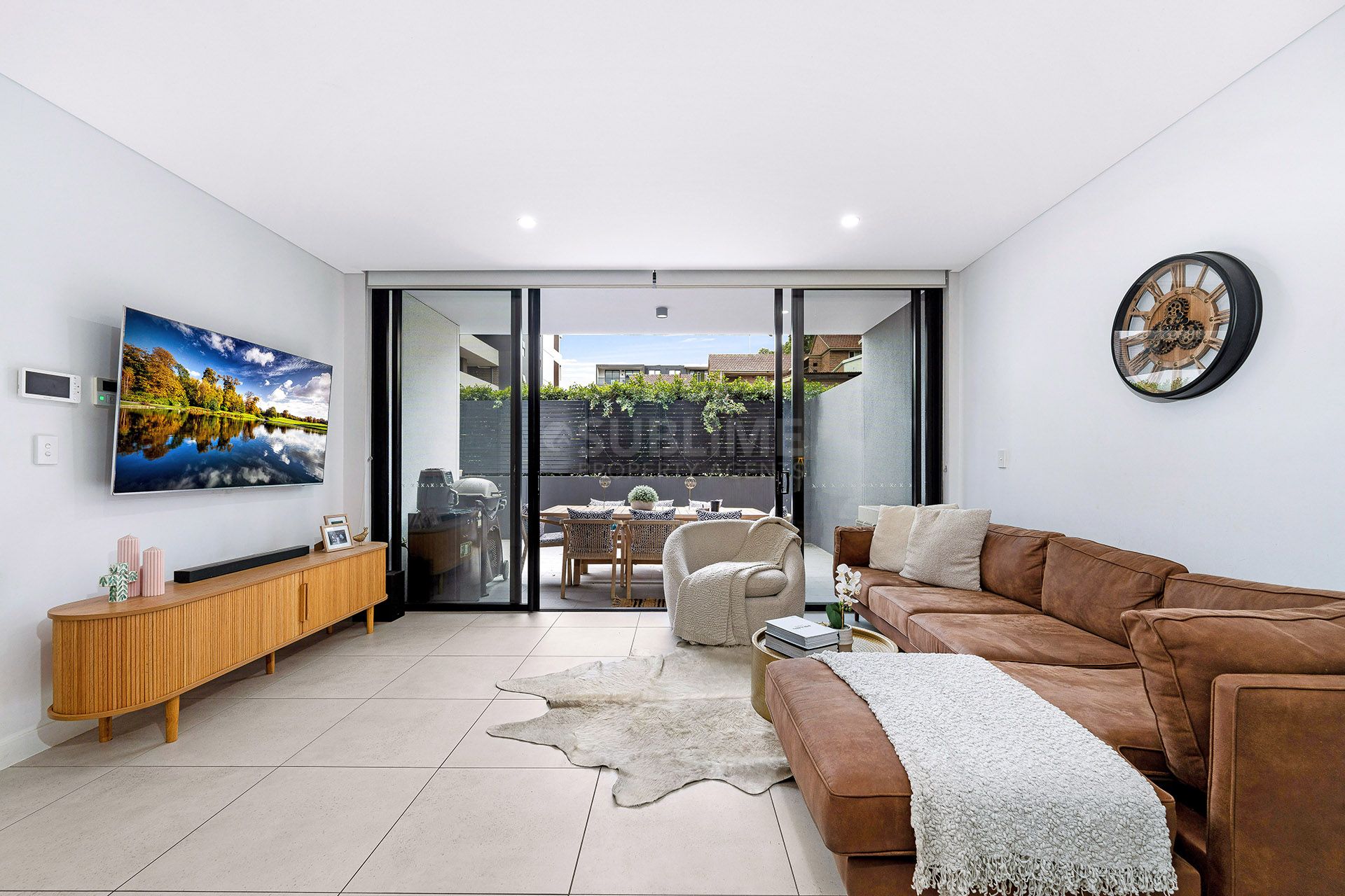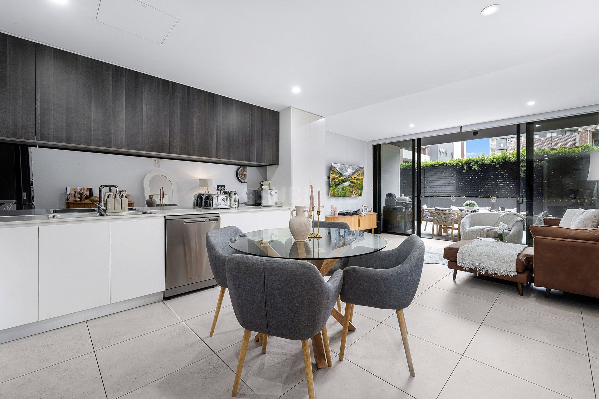 - Stylish open plan living/dining area opening to huge tiled courtyard
