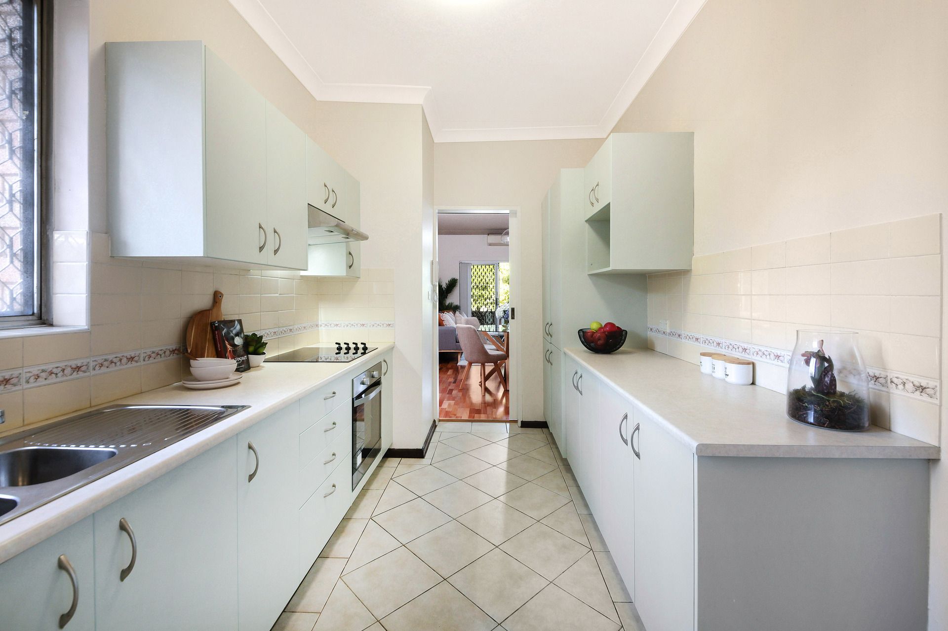 - Renovated galley kitchen with ample cupboard space, leading to large seperate laundry room.