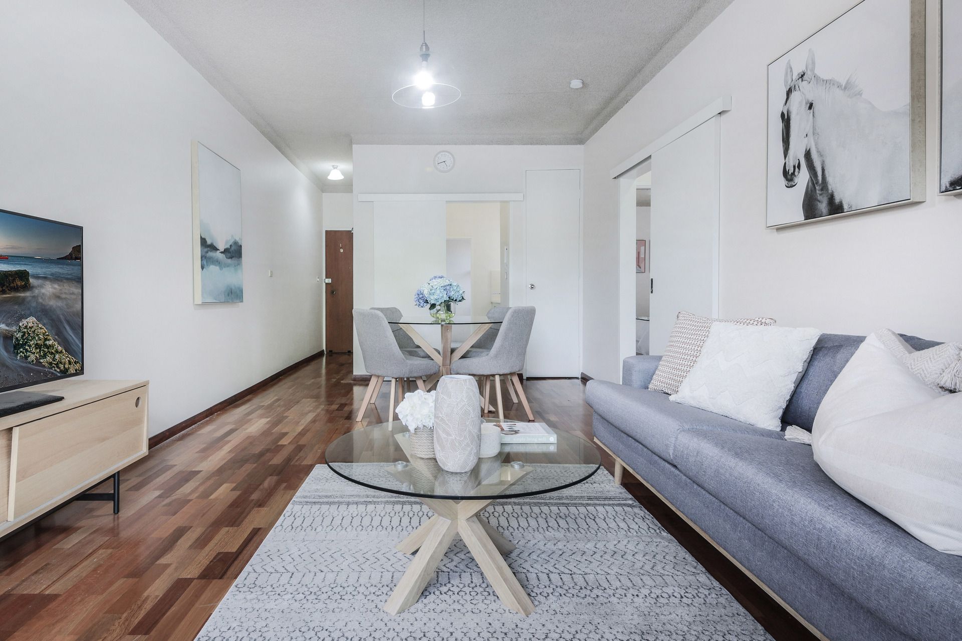 - Open plan living and dining area with air conditioning leading to front facing balcony.