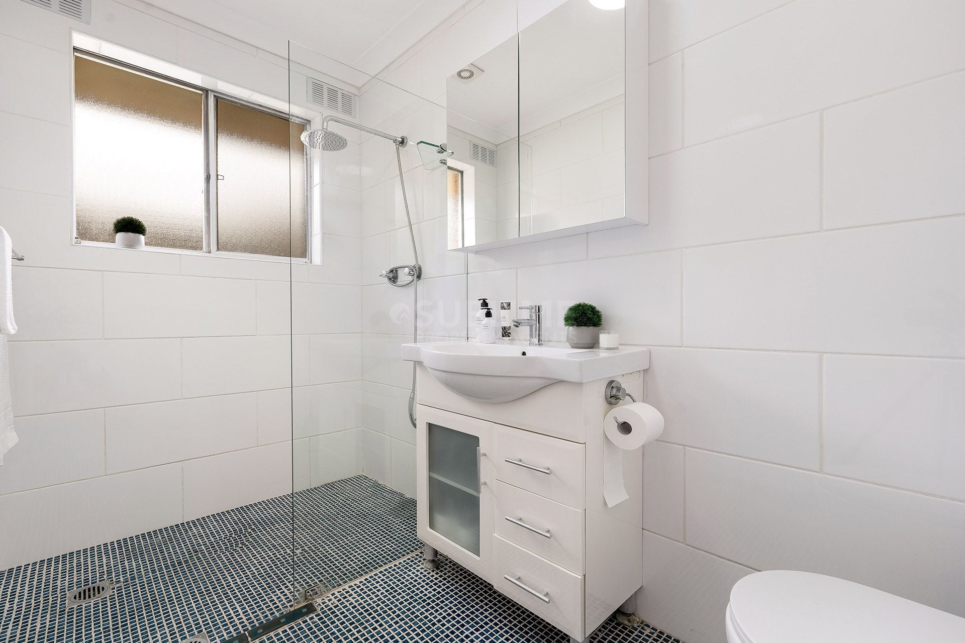 • modern tiled bathroom with spacious shower